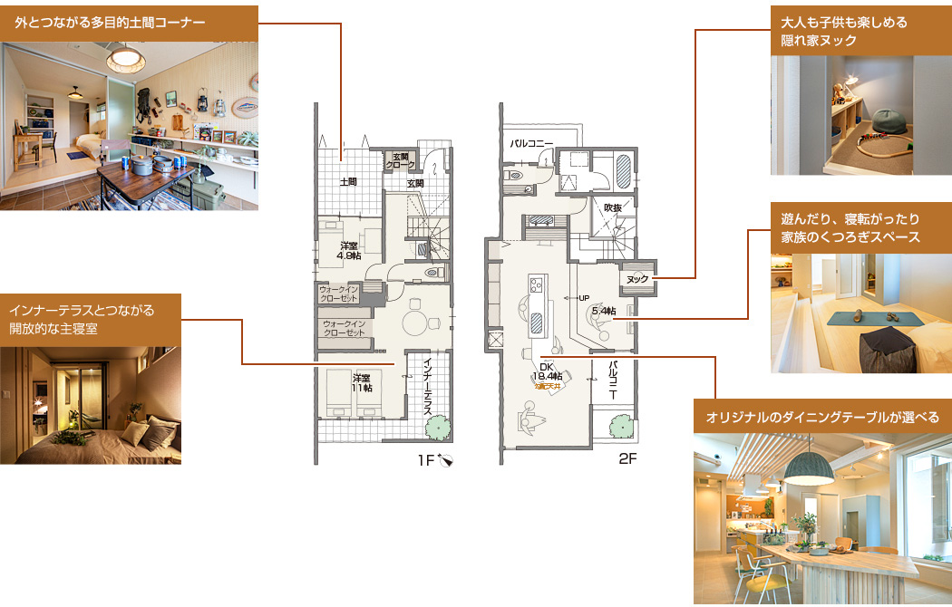 ダイニングキッチンを家族時間の中心とすることで、リビングを多目的ルームとしてエクササイズやホビー等、家族それぞれの過ごし方を楽しんでいただけます。また、玄関とつながる土間も趣味スペースとして、個人時間をゆったり過ごしていただけます。