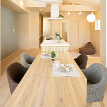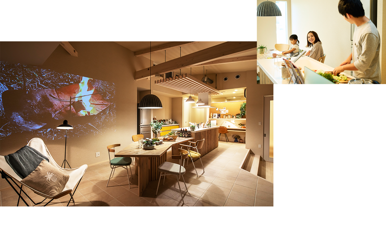 家族が揃う食事の時間、ダイニングキッチンを家族のコミュニケーションの中心にすることで忙しい平日でも家族との時間を大切にお過ごしいただけます。休日には、友人とともに開放的なダイニングキッチンでホームパーティを楽しむことができます。