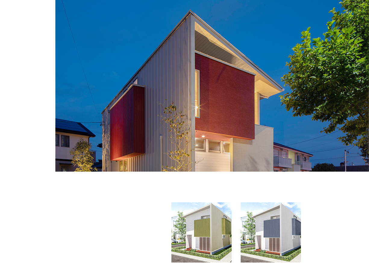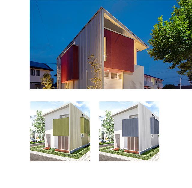 板金素材の大屋根で包み込まれた外観イメージ。屋根裏側などには当社オリジナル木建材「WALLWOOD」や木製サッシなど本物の木を使いやさしい素材感と共に家族のプライベート空間を包みます。カラーバリエーションは3色でエンジ、グリーン、スカイブルーをご用意。