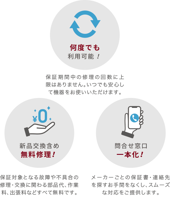 保証期間中の修理の回数に上限はありません。いつでも安心して機器をお使いいただけます。