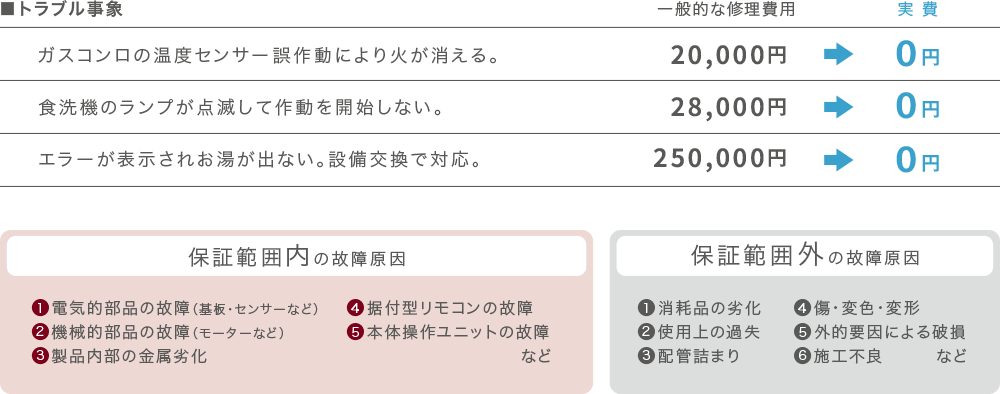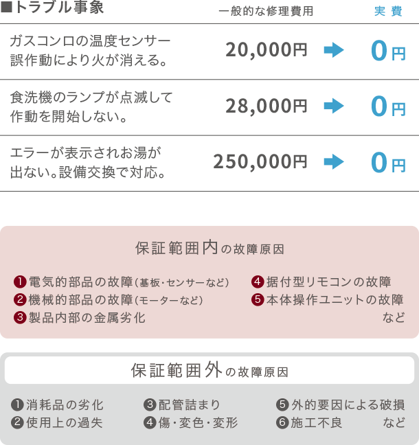 保証対象となる故障や不具合の修理・交換に関わる部品代、作業料、出張料などすべて無料です。